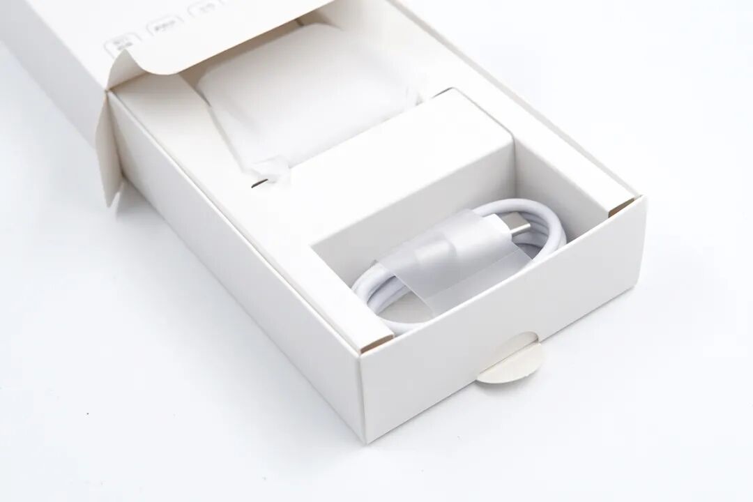 包装盒内部设有两个凹槽分别用来放置充电器和数据线,充电器外套有防尘袋。