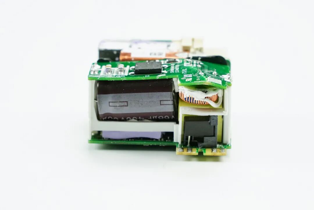 从顶部看去,这款充电器采用前中后三段式布局,前端上方设有一块小板,中间是平板变压器,末端设有二次降压电路板和两块输出小板。