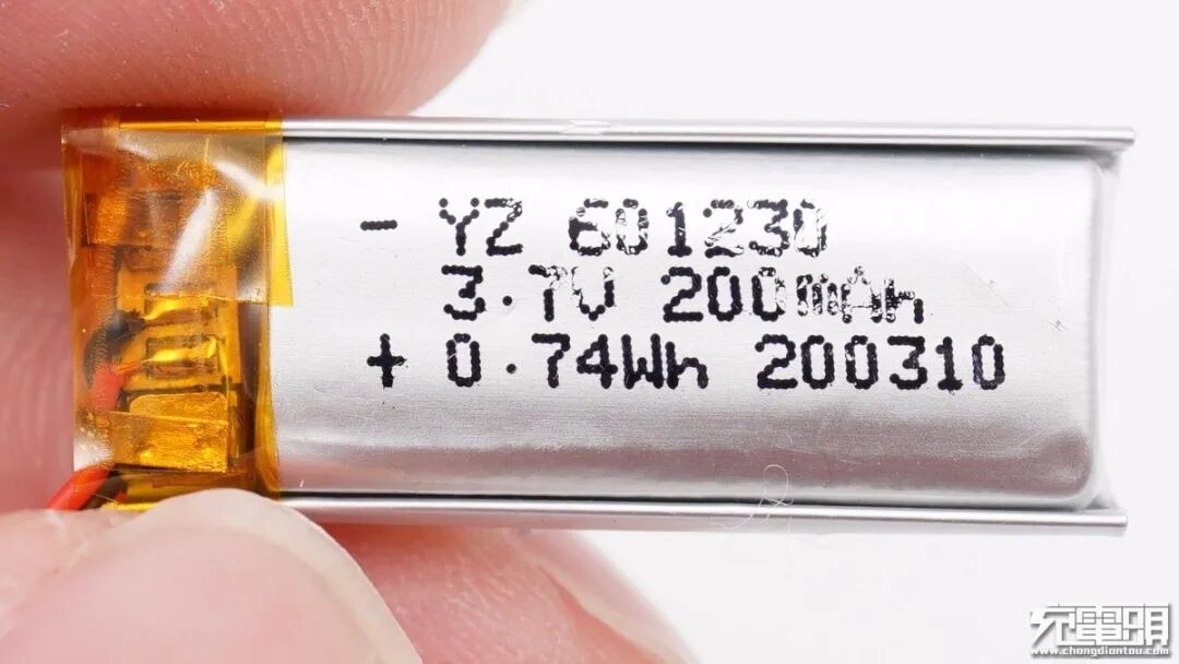 电芯特写,规格为200mAh/3.7V/0.74Wh。