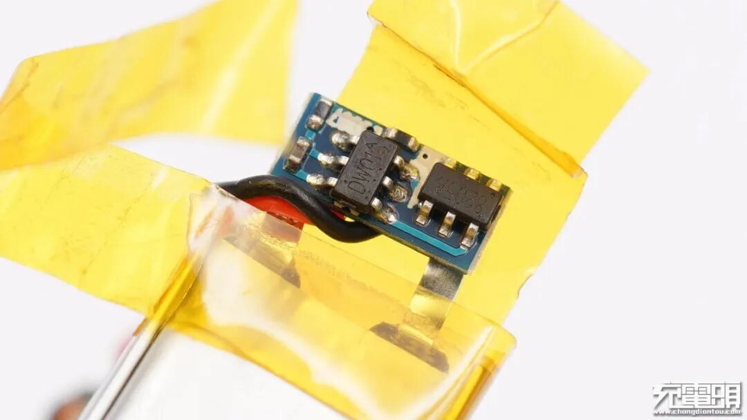 电芯前端包裹绝缘胶带,内部小板上设有电芯保护电路。