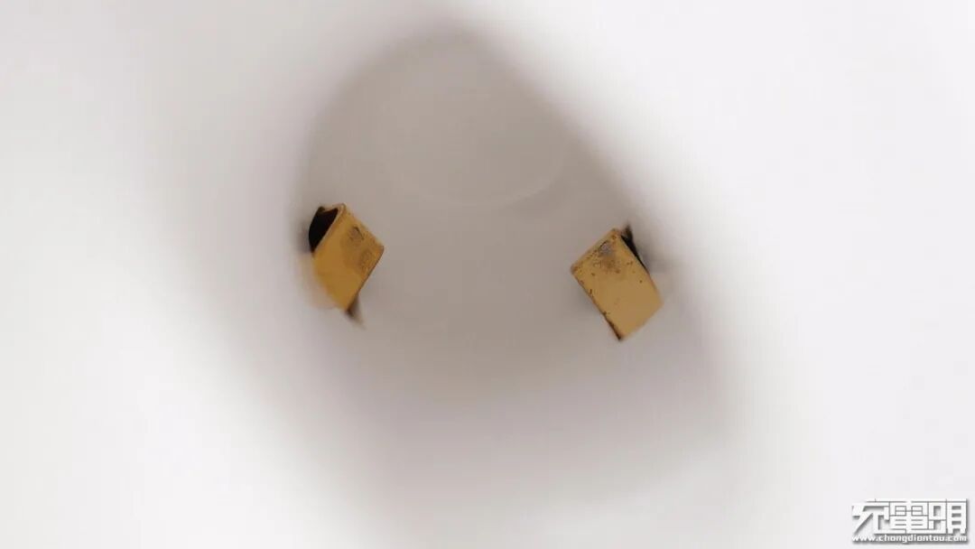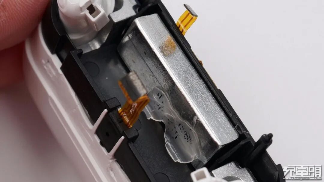 耳机座仓旁边还塞有小铁块。这款充电盒之所以重量与正版的十分相近,就是往内部增加配重铁,可以说是做工不够铁块来凑,十分简单粗暴。