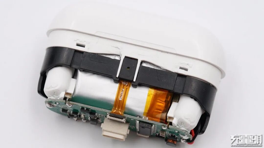 另一面可以看出充电盒内部采用类似三明治结构设计,PCB板和LED灯之间通过排线连接,夹层之间是一块电芯。