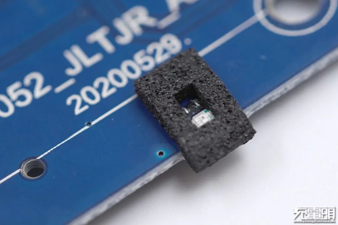 固态电容特写,规格为16V 220μF,来自福建云星电子有限公司。云星固态电容专门针对USB PD快充设计,在105℃的工作环境下仍能保证2000小时的寿命,同时兼具耐高温、耐大纹波、低ESR等特性。