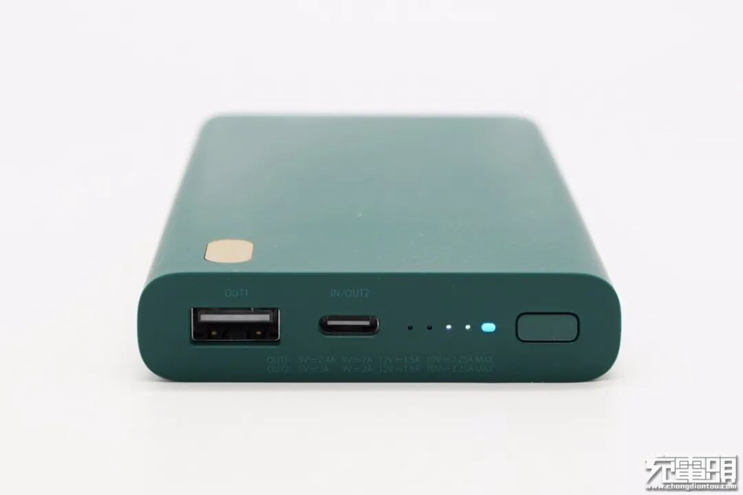 移动电源顶面1A1C两个接口;此外还有四颗电量指示灯和一颗无线充电指示灯,分别亮白光和淡蓝色光;最右侧是电源按键。