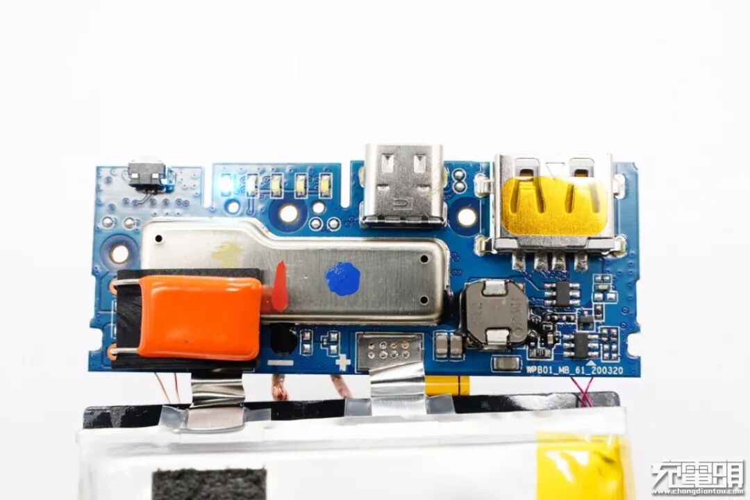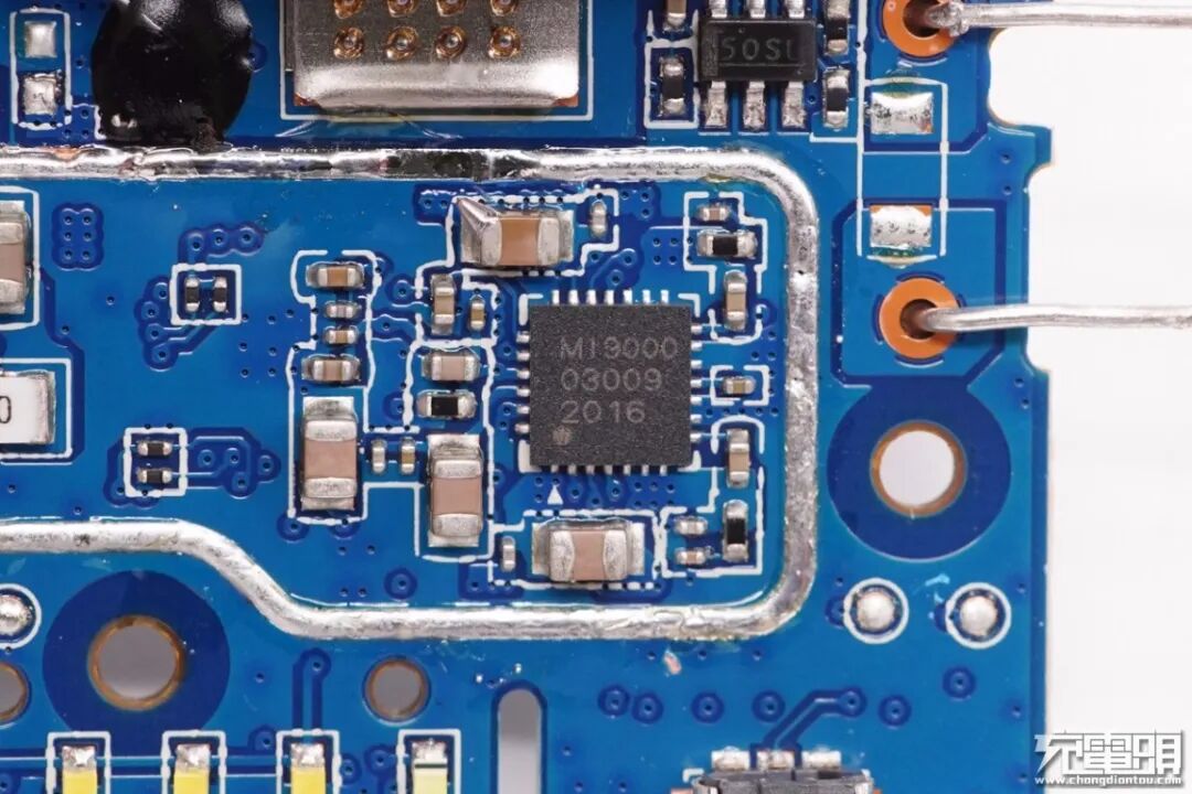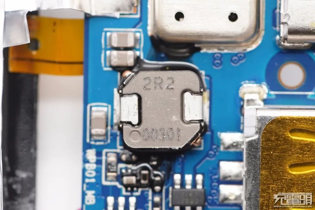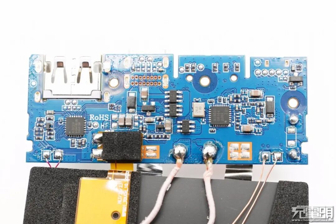 经过对PCB板正背面电路观察发现,紫米10000mAh无线充移动电源采用一颗主控芯片进行控制,通过同步升降压转换电压实现USB输入/输出以及无线充输出的设计架构。下面我们从电芯放电三路输出来介绍各元器件的信息。