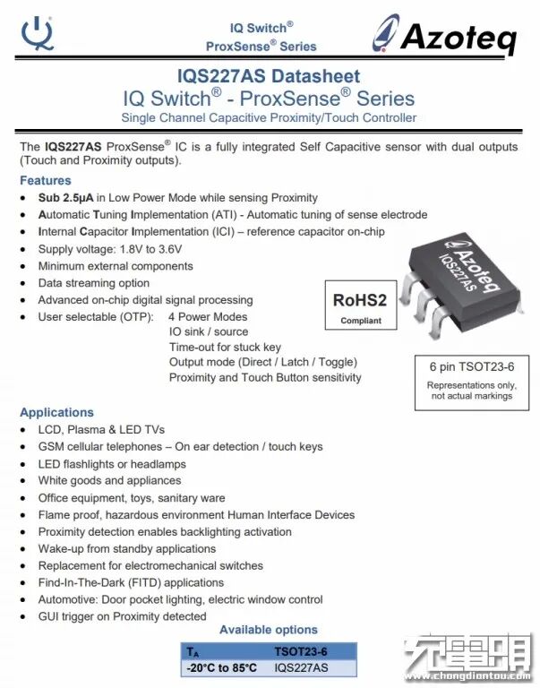 Azoteq IQS227AS触摸检测IC,配合触摸检测贴片检测手机放置,而无需按动按钮启动无线充电检测,更加智能节能。