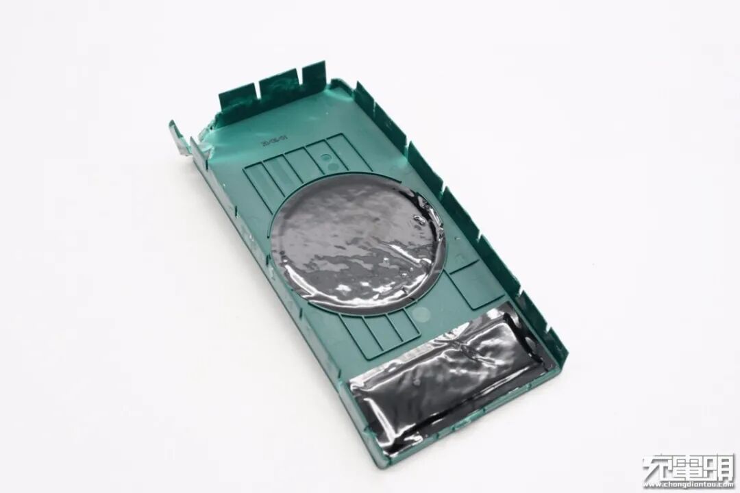 背面机身壳对应无线充电线圈和PCB板处贴有导热贴。