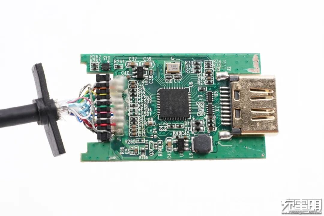 eeco USB-C to HDMI转换器线缆做了抗弯折处理,机身壳两侧弧面设计,造型经典。充电头网通过拆解了解到,机身内部线芯注塑加固和保护,HDMI接口沉板过孔焊接。电路上设有赛普拉斯CY7C65210和CYPD1120、ISSI 25LQ020B、谱瑞PS171等知名厂家芯片,用料做工扎实。