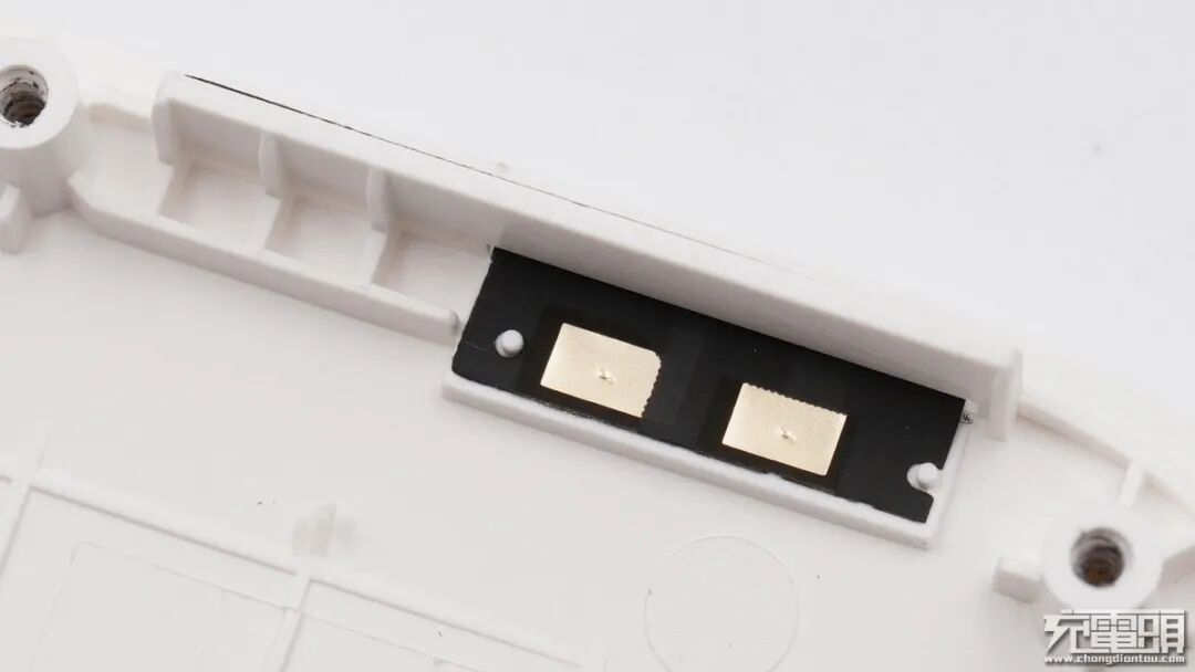 电池顶部特写,中间是过水标签,右侧是电池触点。