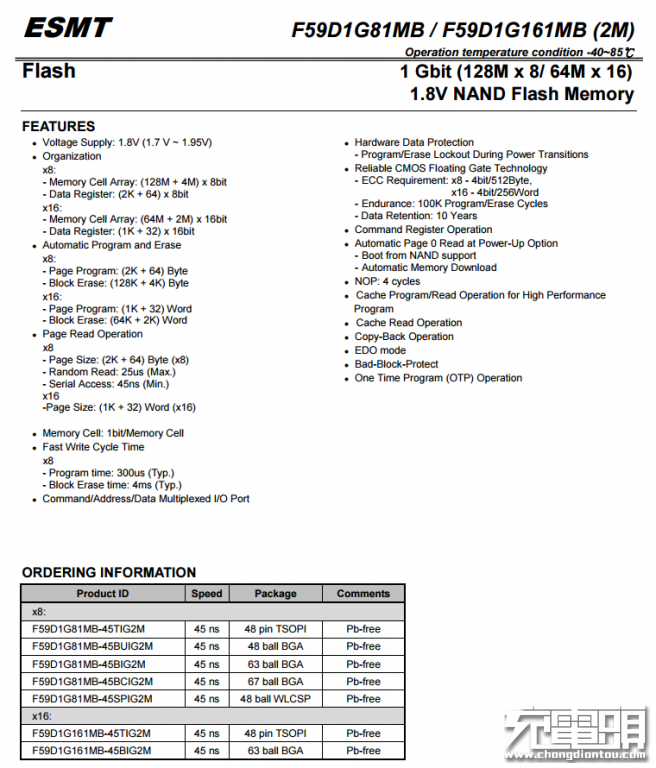 晶豪F59D1G81MB,128MB SLC FLASH存储器,支持10万次擦写,10年数据保存期,用于存储固件及连接信息。