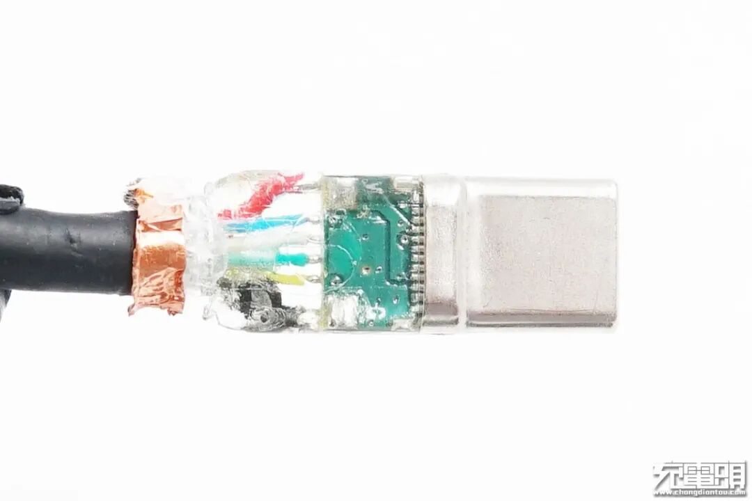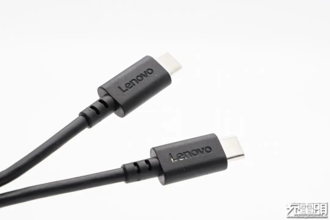 联想100W PD快充数据线长1.8米,可满足绝大多数场景使用;采用TPE黑色外皮,线头抗弯折和磨砂处理,方便插拔使用。充电头网通过拆解了解到,线览内置屏蔽锡纸和棉线,棉线可以降低硬值让线缆更加柔韧,使用体验感好,而线芯内有抗拉线填充,提升了线缆抗拉性能。从充电器和数据线的拆解我们发现,这款产品使用到了慧能泰的协议芯片和E-Marker芯片,芯片性能优异,得到联想认可。
