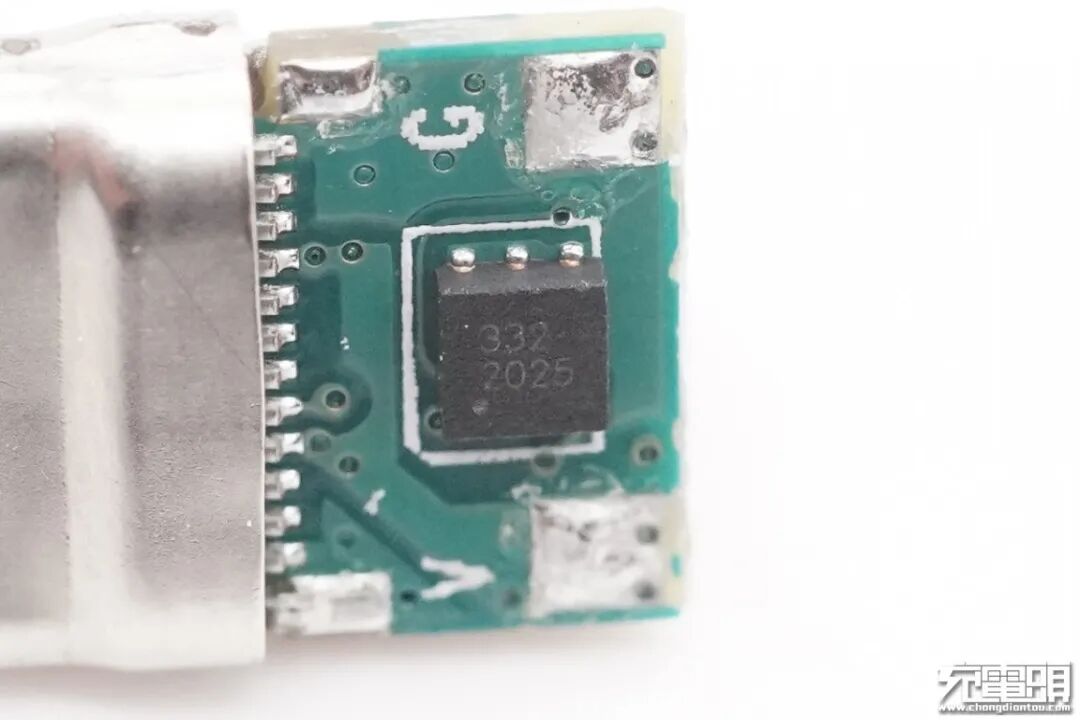 E-Marker芯片特写,采用慧能泰半导体HUSB332。这是慧能泰推出的最新一代耐高压电子标签芯片(eMarker),已经通过了USB-IF协会认证,TID号:875,其针对市场上客户的各种应用和兼容性反馈,作了一系列的性能改善和可靠性提升。HUSB332可被搭载在USB2.0线缆(5A线缆)、USB3.0线缆、USB3.1线缆、USB3.2线缆和40Gbps线缆上。
