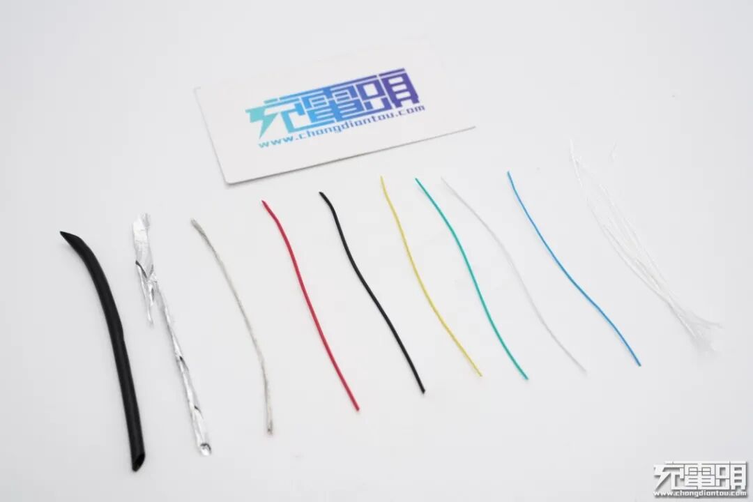 线身切开一个斜面,内部由6根带颜色的线芯和裸露的电力线芯组成。