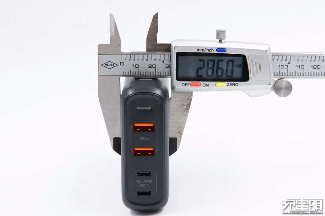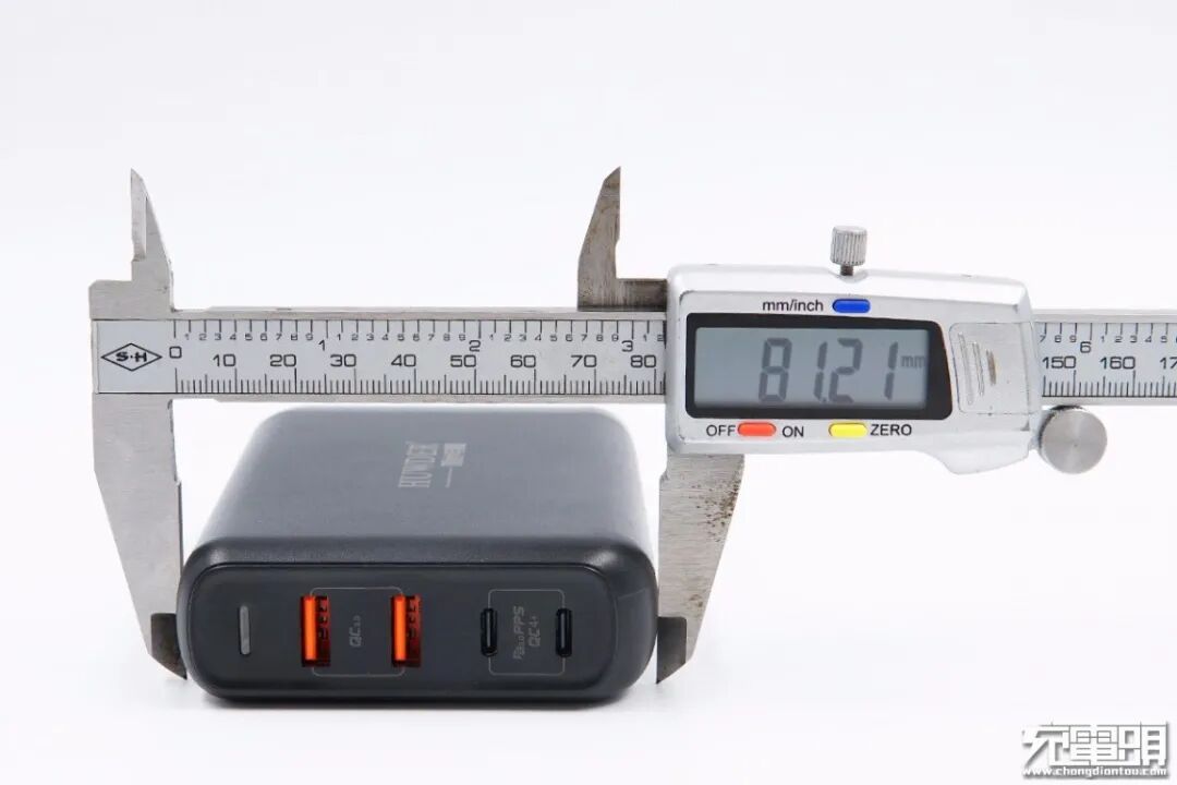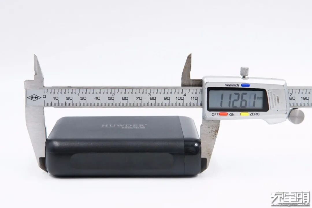 使用游标卡尺实测充电器机身长度为112.61mm。