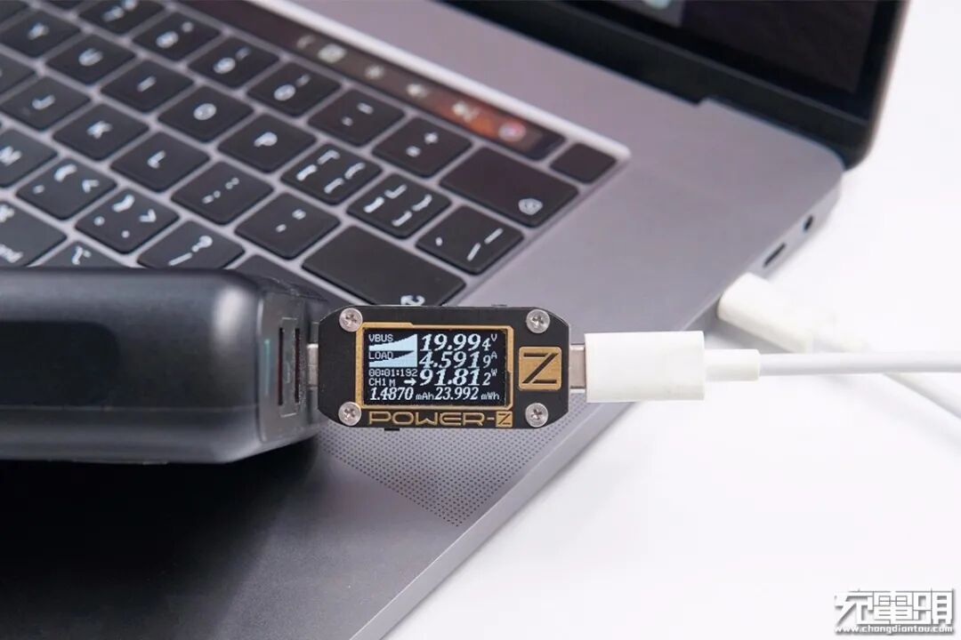 另外使用这款充电器为苹果最新款MacBook pro进行充电,测得充电功率为19.99V 4.59A 91.81W。