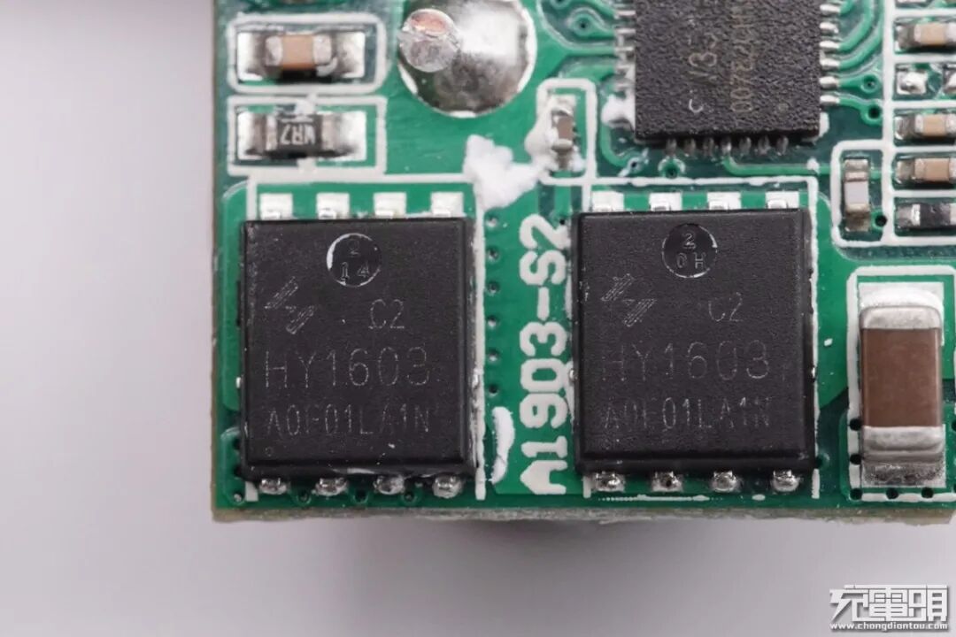 外挂两颗华羿HY1603C2 MOS管来为USB-C口输出同步整流降压,NMOS,耐压30V。
