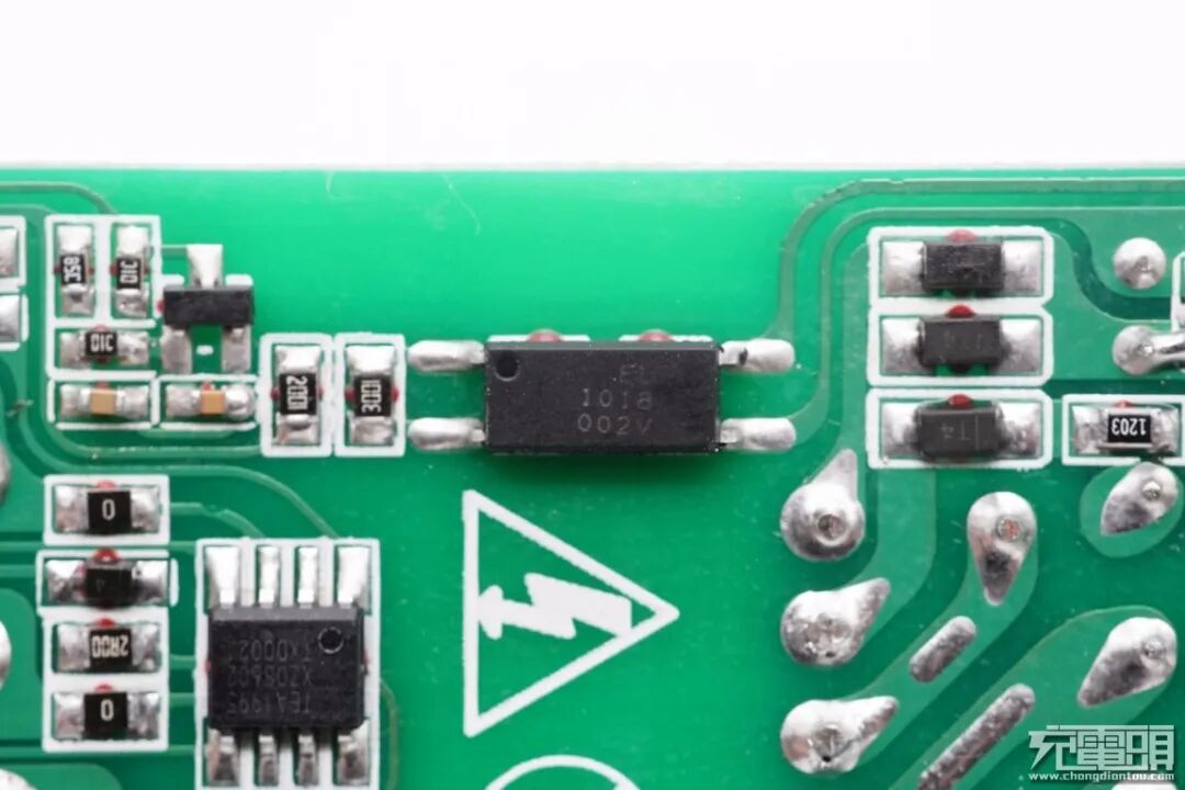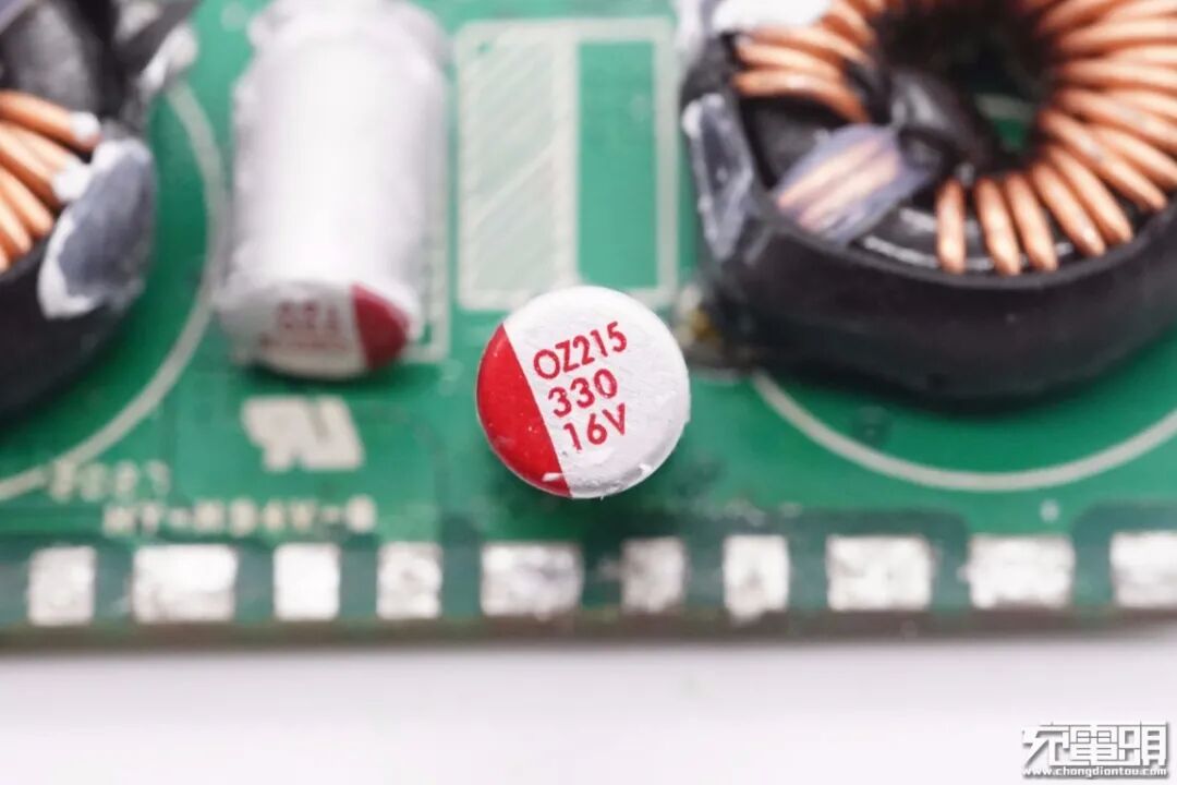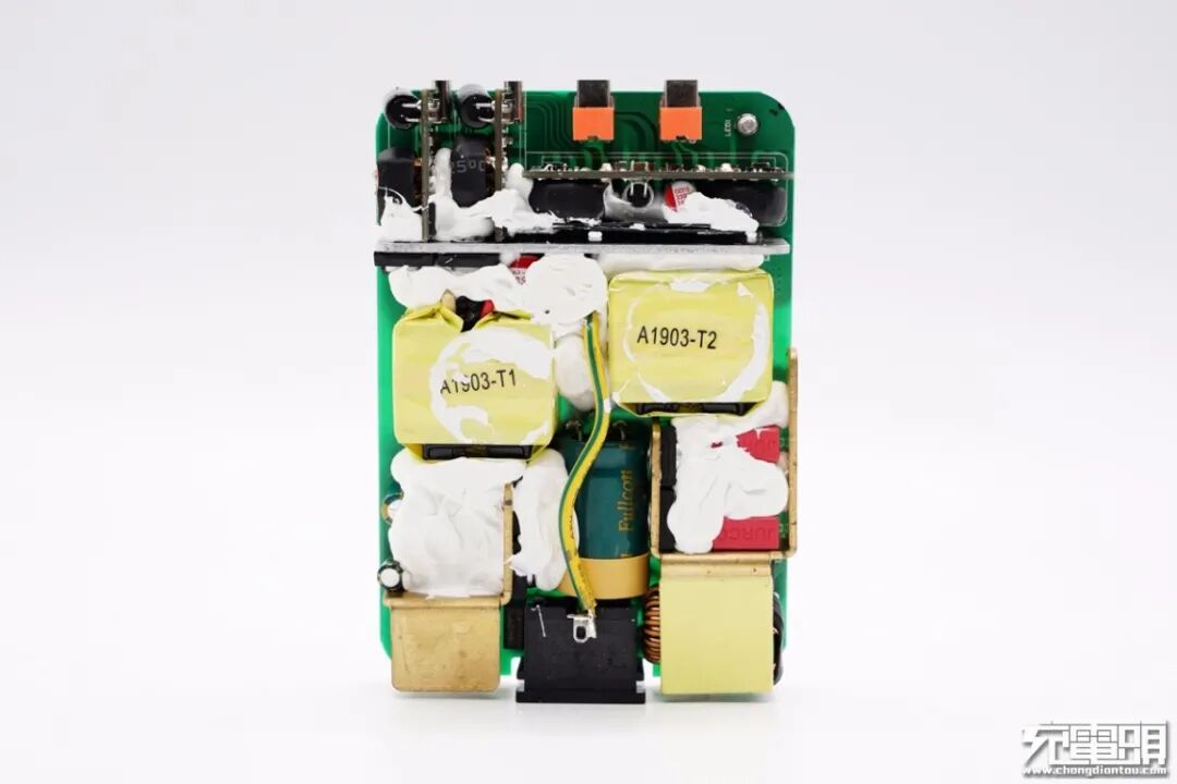 拆掉散热板,可以看到板子两侧元器件规划布局得很整齐,中心放置一颗大电容,顶部套有绝缘套,输出端设有多块小板,可以提高空间利用率降低充电器体积。