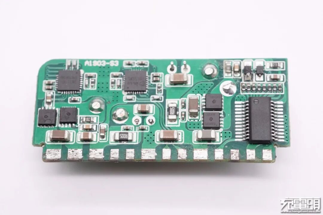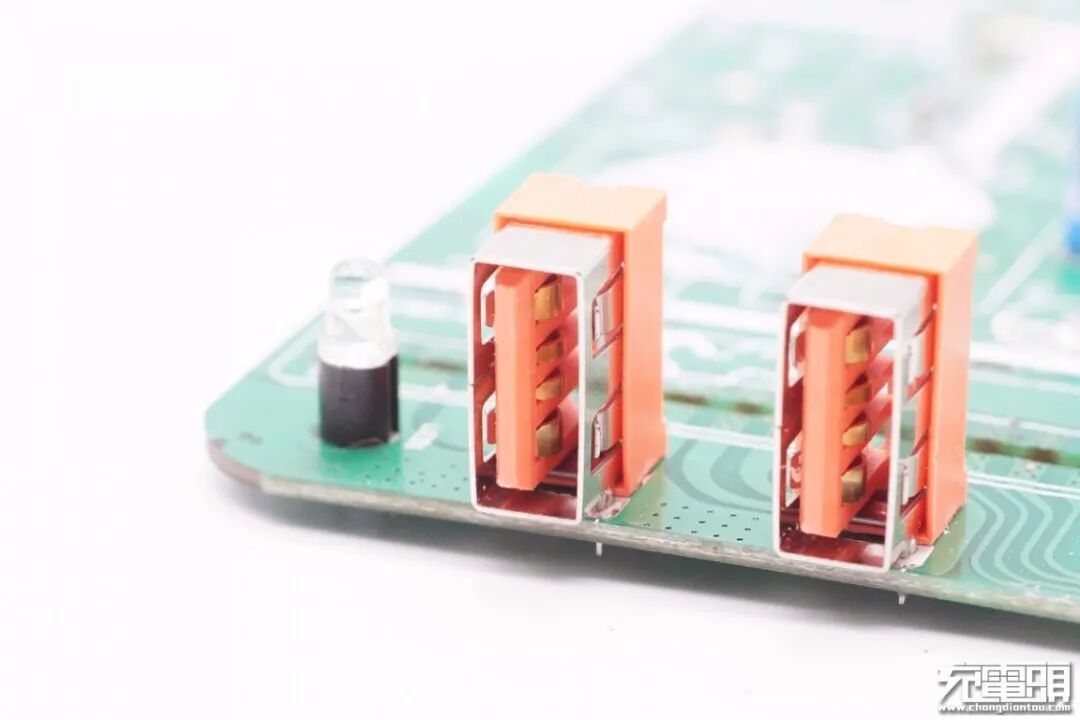 将USB-A母座后面的小板拆下,可以看到设有两路独立降压电路分别用于两个USB-A口降压输出,最右侧一颗单片机用于四路输出功率分配。