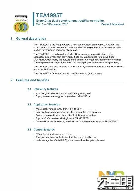 次级侧采用恩智浦TEA1995T的同步整流控制器,用于LLC双绕组同步整流。