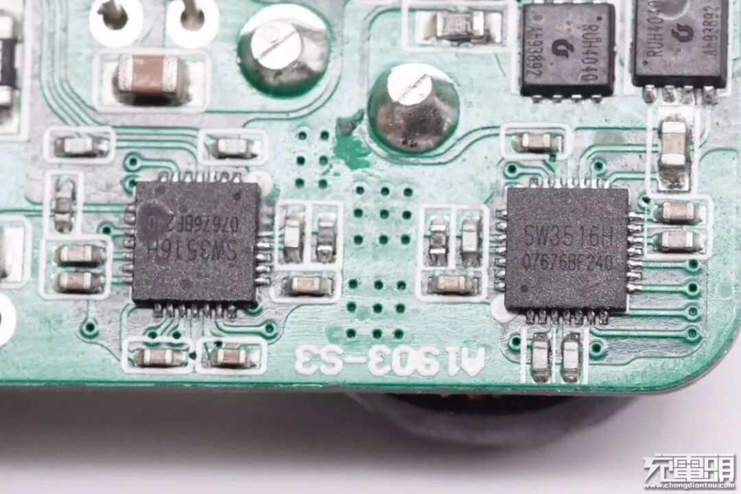 两个USB-A降压电路主控芯片采用的是智融SW3516H,分别用于两个A口降压控制和协议识别,因此两个接口的性能完全一样。