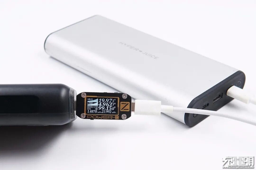 最后拿鸿达顺这款充电器给100W移动电源进行充电测试,使用POWER-Z KM001C测得充电功率为19.97V 4.96A 99.15W,成功开启100W PD快充。