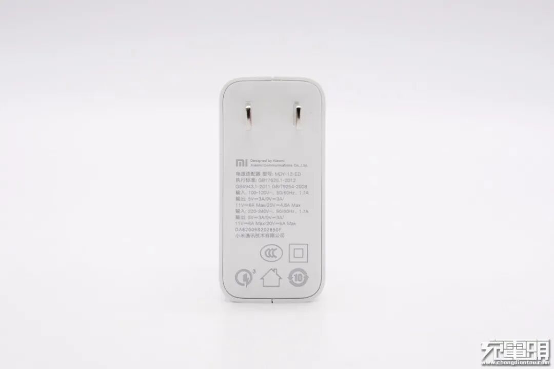 小米原装120W充电器采用PC阻燃材质白色外壳,整体设计风格简洁,充电器腰身亮面设计,输入输出端外壳磨砂处理,此外配备固定式国标插脚。