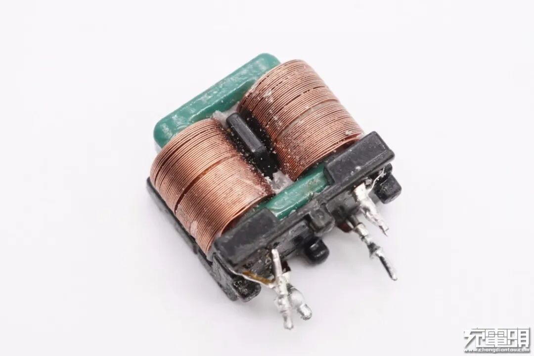 共模电感两级设计,另一颗绿色磁芯扁平铜带绕制,两颗用于滤除EMI干扰。