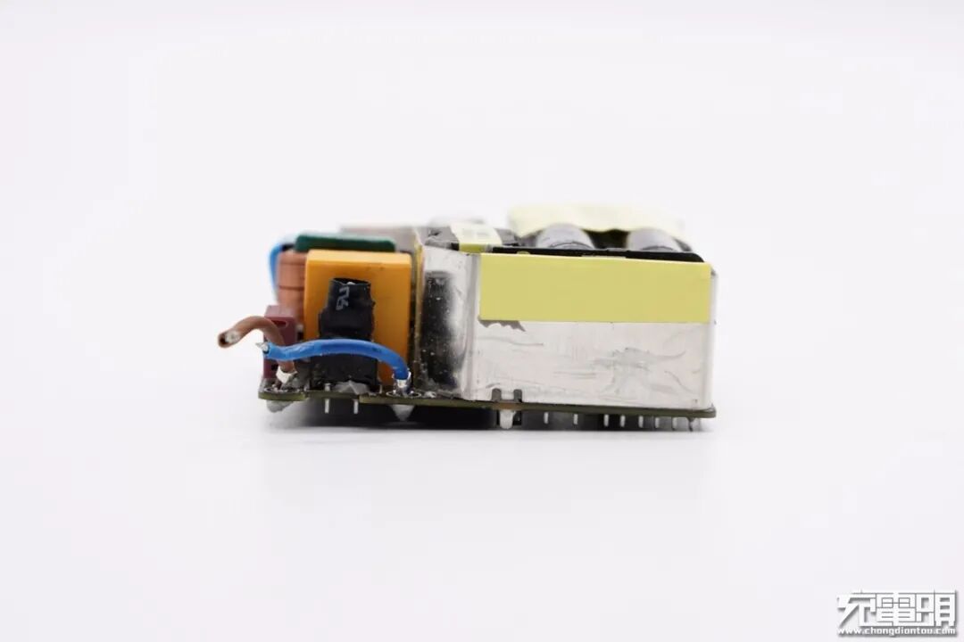 PCB板侧面一览,设有保险丝、X电容、共模电感和滤波电容等器件。