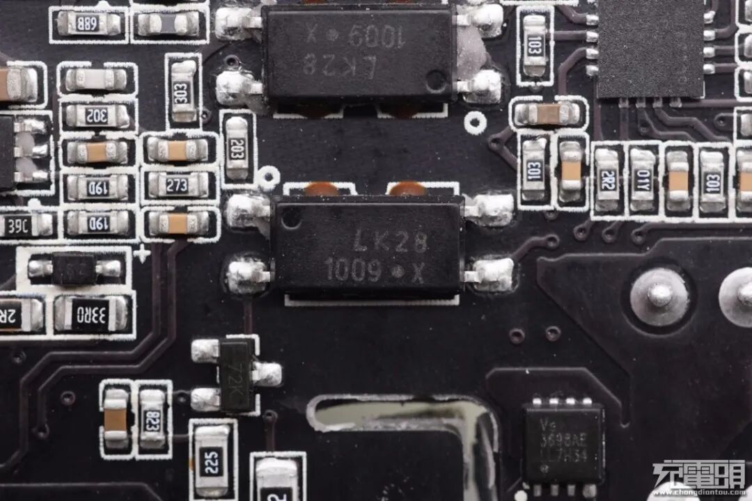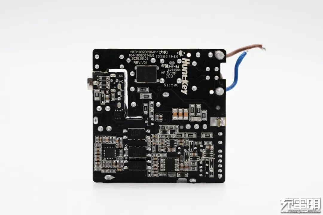 PCB板背面一览,设有主控和协议等芯片,初次级之间有三颗光耦。此外充电器PCB板上印有HuntKey航嘉代工。