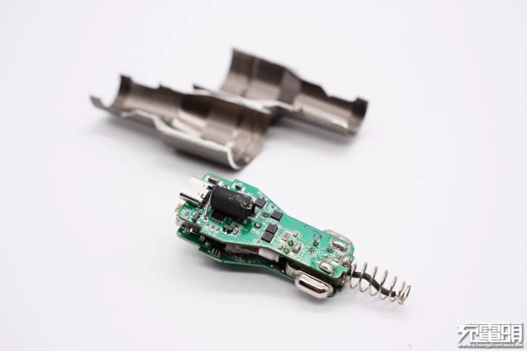 充电头网通过拆解发现,这款产品内置两块小板,分别设有两路独立降压电路。USB-C电路采用南芯SC8701进行升降压,由赛普拉斯CYPD2134进行协议识别控制输出;USB-A电路采用德信EUP3270进行降压,天德钰FP6601Q进行协议识别输出。这款车充虽采用全金属外壳设计,但在正极端头处采用塑料螺纹来进行封装和隔离,设计巧妙,负极弹片上塞有胶垫,延长车充使用寿命。