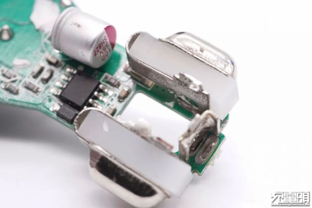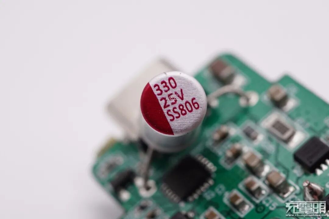 USB-C母座所在小板一览,输入端有一颗保险丝,设有升降压开关管、协议芯片和固态电容等器件,电容外套绝缘管保护。