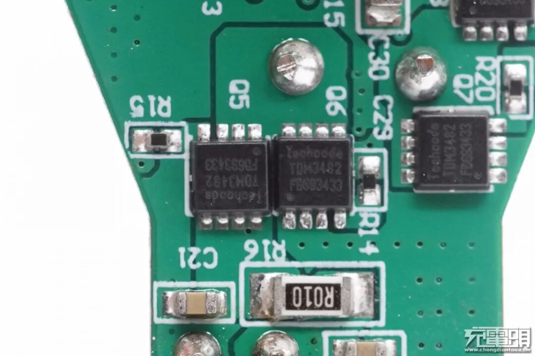 USB-A口协议芯片采用天德钰FP6601Q。这是一款快速充电协议芯片,支持高通 QC3.0/2.0与华为FCP,通过监控USB D+/D-上的电压数据自动调整供电设备上的输出电压,互相握手识别后设备提升充电功率缩短充电时间。在本身就支持QC3.0,QC2.0和FCP的情况下,还能自动识别APPLE、三星、BC1.2协议。