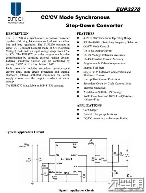 Eutech德信EUP3270降压转换器,内置开关管,支持完善的保护功能,用于USB-A口降压输出。