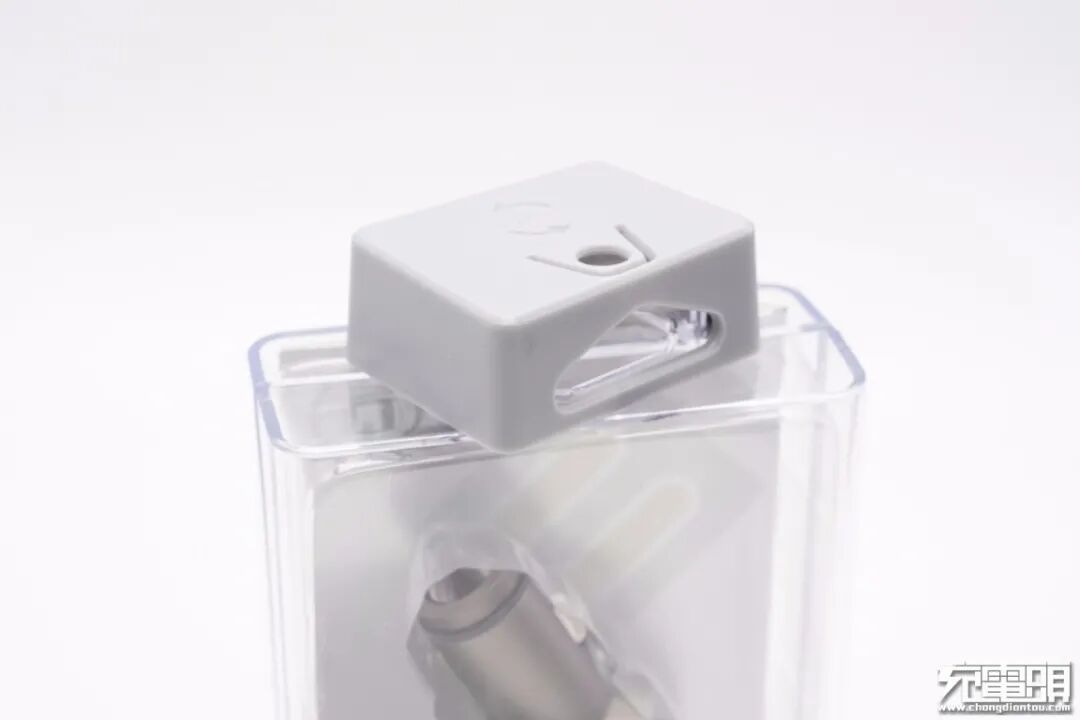 盒子顶部设有灰色塑料挂钩,旋转取下后可将包装盒打开取出车充。