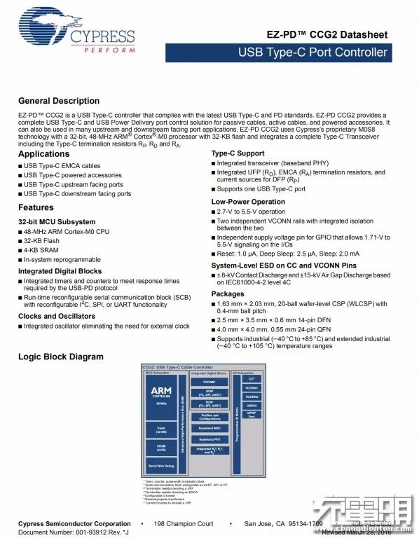 CCG2使用赛普拉斯的专用M0S8技术,该技术使用了带有 32 KB 闪存的 32 位 48 MHz ARM Cortex-M0 处理器;该处理器集成了一个包括 RP、RD和RA Type-C型电阻的完整的Type-C型收发器。赛普拉斯CYPD2134是最早一批USB PD控制器之一,已通过了USB PD2.0认证,充电头网此前已经对其做了详细报道。