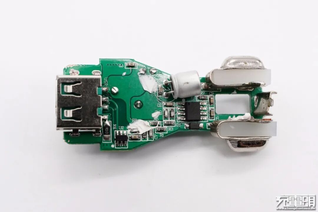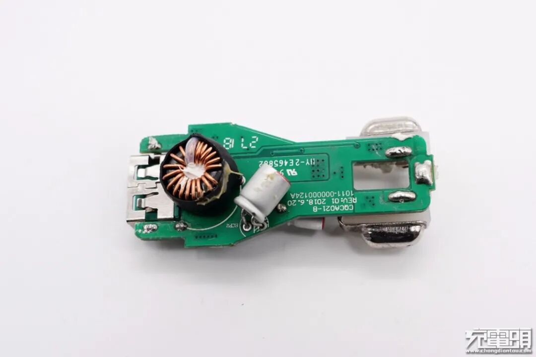 USB-A母座所在小板一览,输入端对应滤波电感处镂空,降低厚度。此外板子上设有降压转换器、协议芯片和电容。