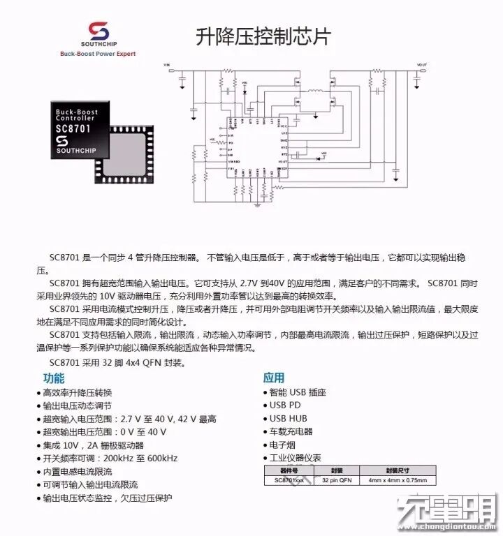 USB-C口升降压控制器采用南芯半导体SC8701。这是一个同步4开关降压升压控制器,它可以有效地输出电压,无论是高、低或等于输入电压。同时也支持非常宽的输入和输出电压范围,它可以支持2.7V到36V的输入范围和2V到36V的输出范围。驱动器电压设置为10V,以充分利用外部mosfet实现最高效率,用于Type-C接口升降压电压转换。