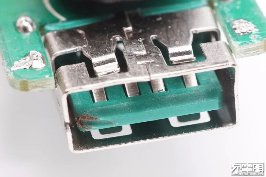 USB-A母座特写,沉板过孔焊接。