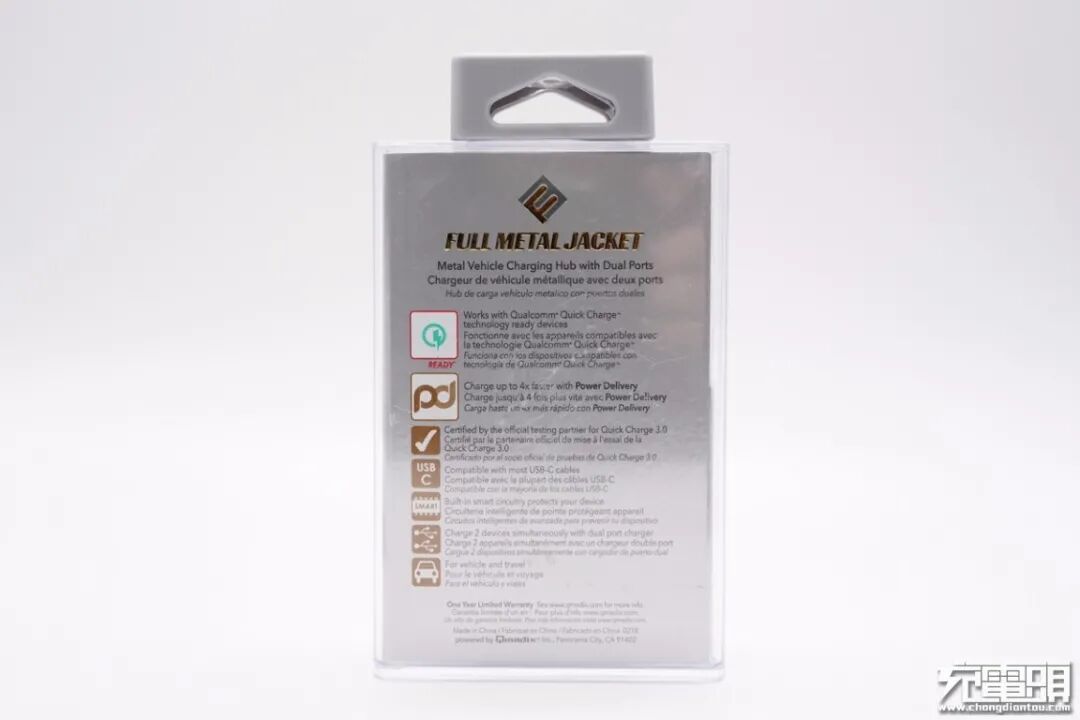 产品采用透明塑料盒包装,可直接看到车充实物,展示效果好。盒子内置信息纸板,正面印有品牌名称,以及USB PD和QC3.0快充标识。