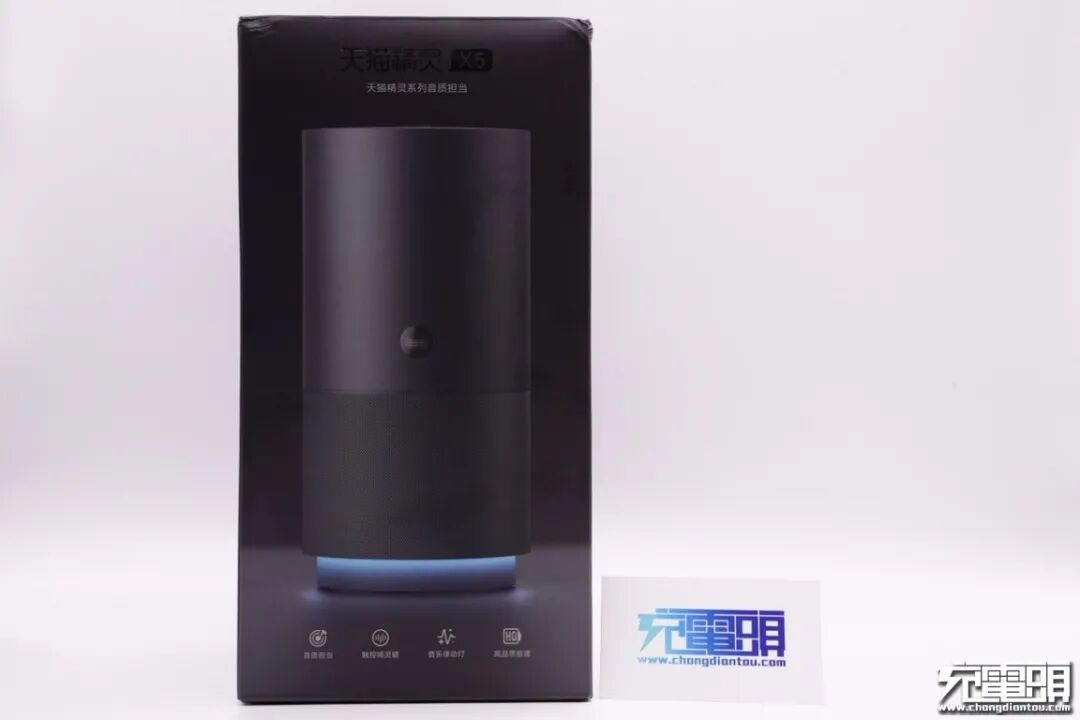 包装盒正面印有天猫精灵X5智能音箱外观图,上方是产品名称,下方是产品四大特性标识。