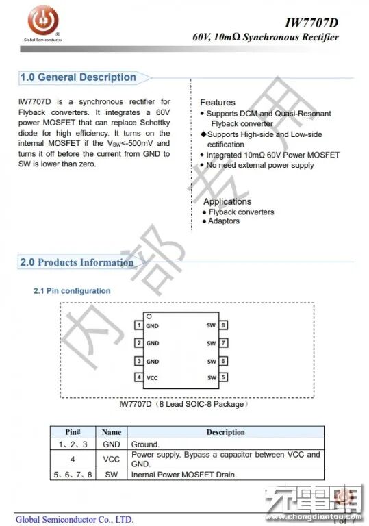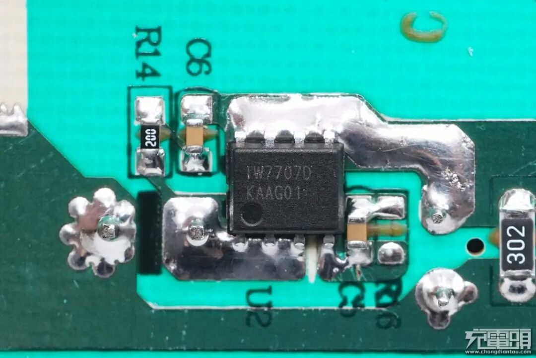 次级同步整流芯片同样来自环球半导体,型号IW7707D,内置60V耐压MOS管和控制器,外围元件精简。