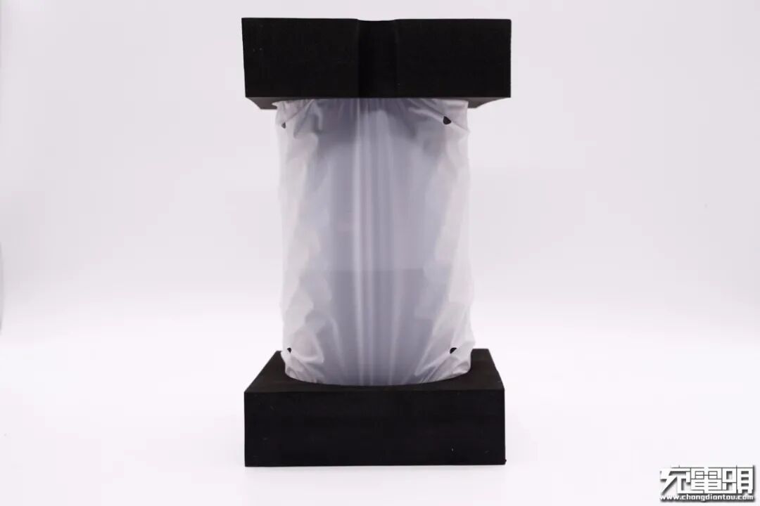 将天猫精灵X5智能音箱取出,上下端有黑色EVA进行固定保护,自身外套有防尘袋。