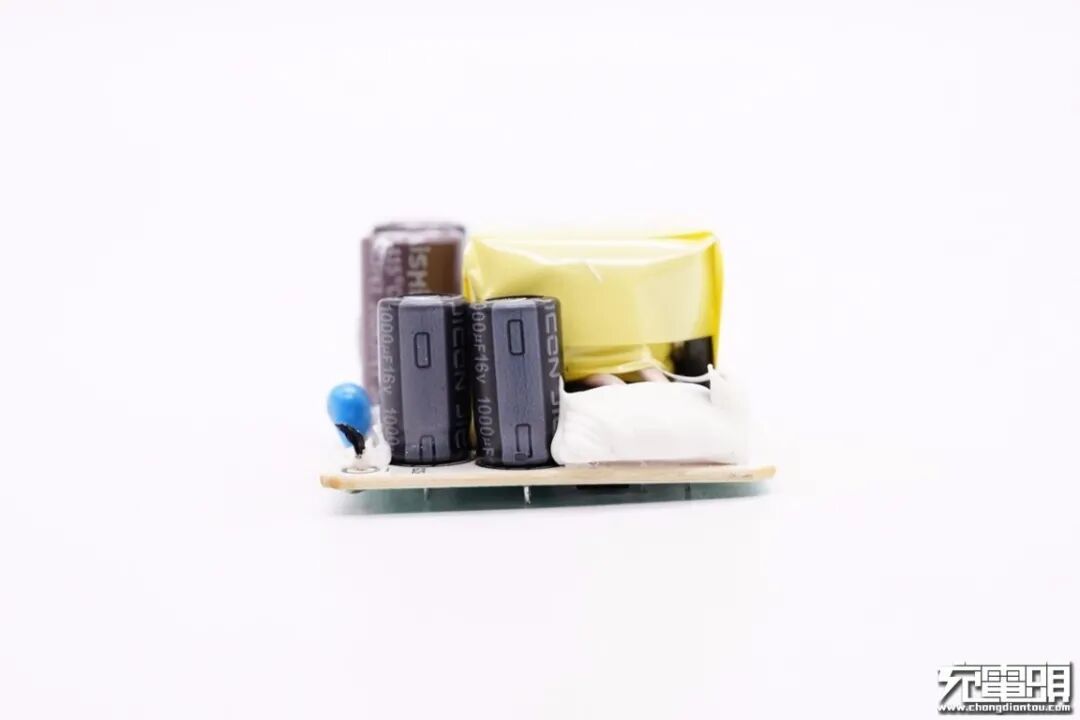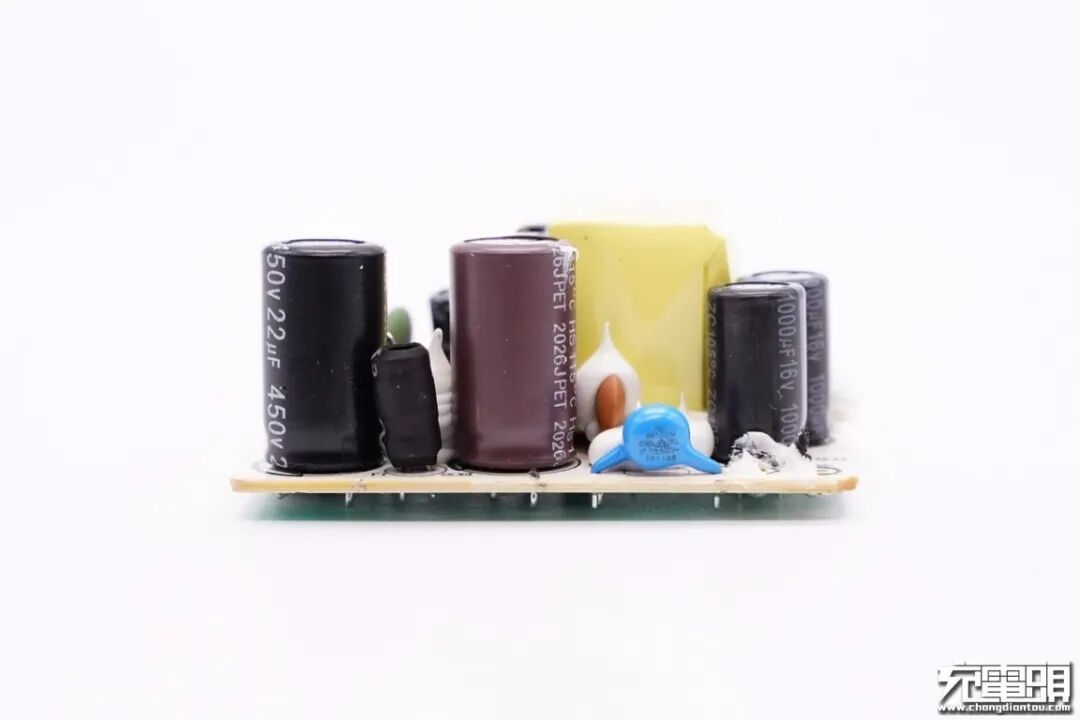 PCB板正面一览,元器件分布相对稀疏,不易积热,并且变压器和电容等元器件打胶处理,增强内部稳定性。