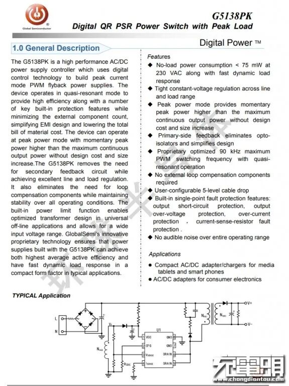 PWM主控芯片采用GlobalSemi环球半导体的G5138PK,该芯片集成了数字PWM控制器和650V高压MOSFET。环球半导体G513X/G523X系列是一款高性能高精度的数字技术功率开关,拥有DIP和SOP两种封装形式。