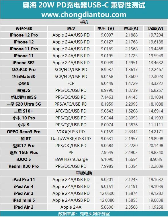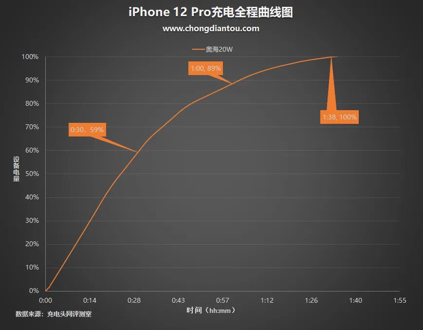充电测试数据制作成表格,奥海20W PD充电器半小时为iPhone 12 Pro充入59%电量;1小时充入89%电量。