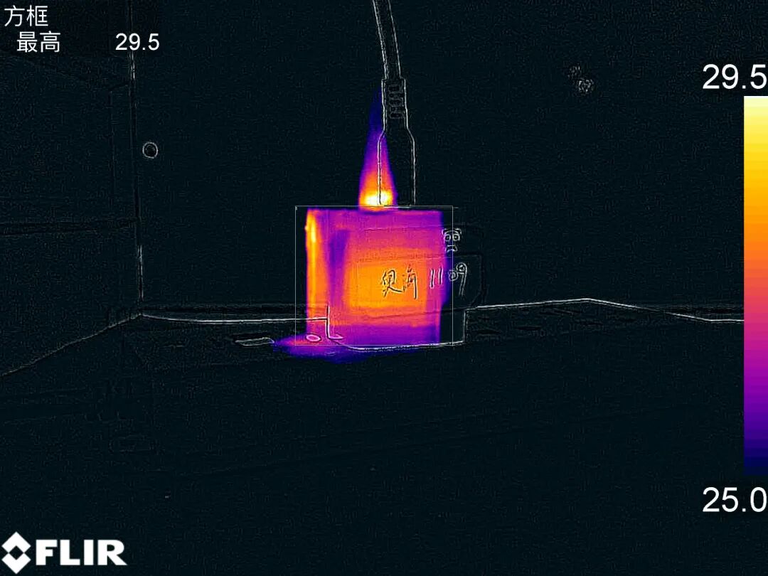 对充电器的温升进行测试,测试条件为在温度约为25℃的恒温箱内以12V 1.67A 20W的功率持续输出一小时进行测试。准备开始测试前,最高温度为29.5℃。
