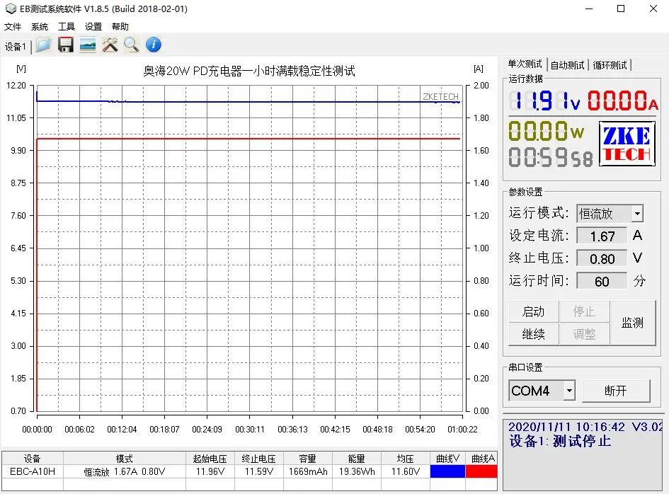 使用EB程控电子负载测试奥海20W PD充电器的最大输出功率,以0.1A为电流步进幅度,10秒为时间间隔,最终录得最大输出为11.57V 1.90A 22W。