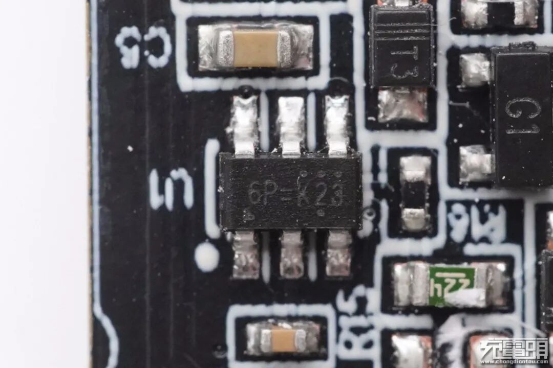 PWM主控芯片特写,丝印6P=K23,来自立锜科技,型号RT7752。该系列专门设计用于与控制器配合使用,为USB PD或可编程电源适配器提供整体解决方案。该芯片在5V待机状态下,可以实现高效率,满足安全标准,功耗小于50mW。