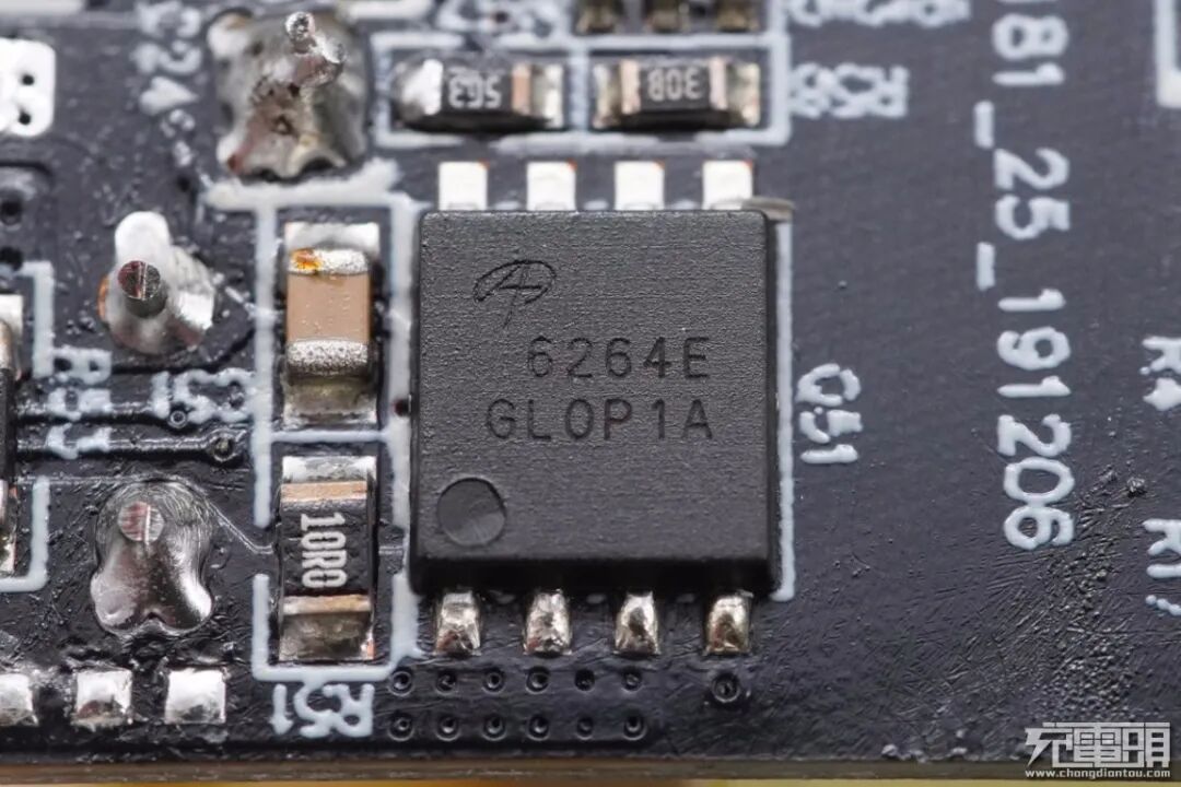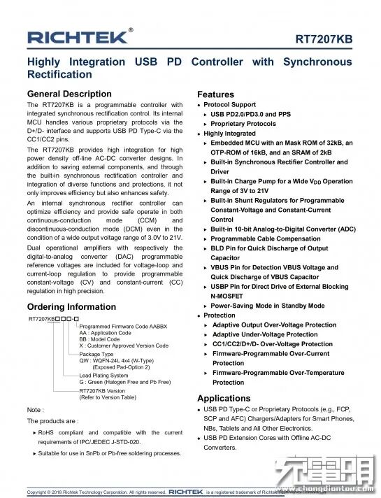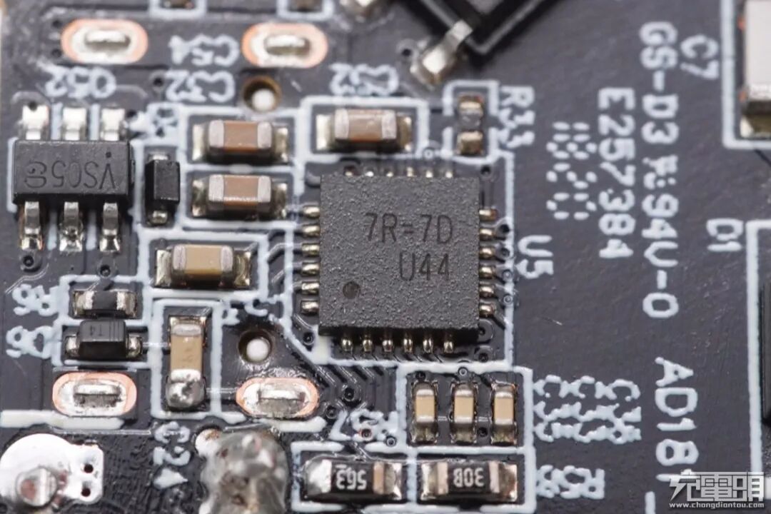 USB PD协议芯片控制器来自立锜科技,丝印7R=7D,实际型号为RT7207KB。这是一种集成同步整流控制的可编程控制器。其内部MCU通过D+/D接口处理各种专有协议,并通过CC1/CC2引脚支持USB PD Type-C。内置电荷泵,可编程的线缆补偿,支持自适应的过压,欠压保护,数据线过压保护,可编程的过流过热保护。