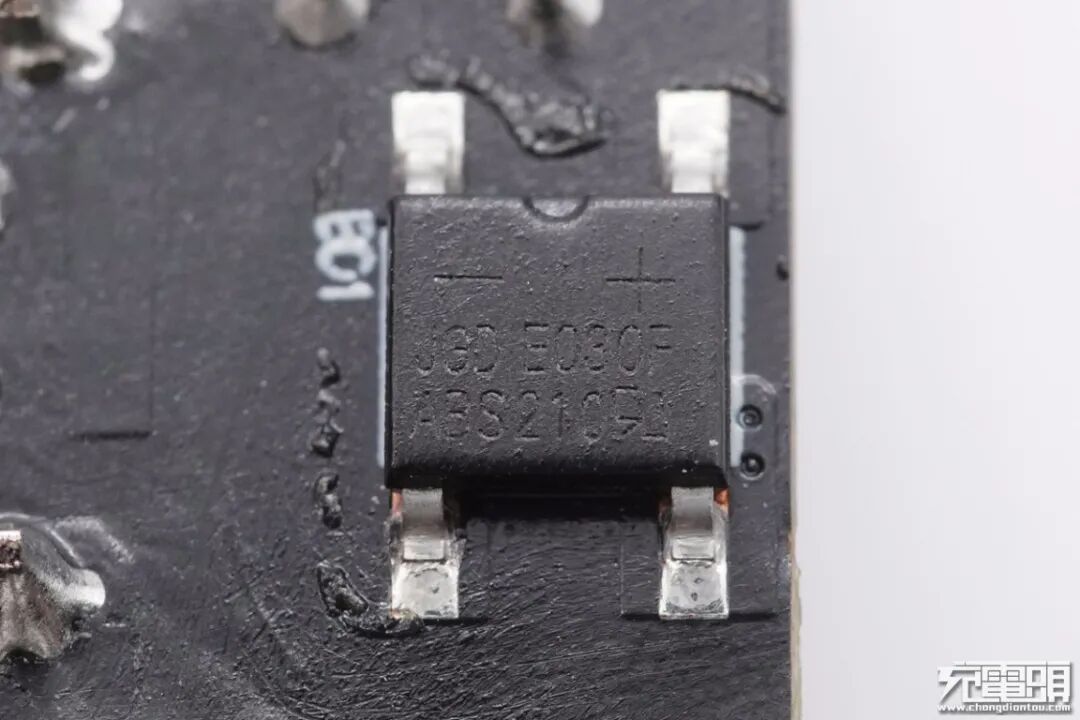 PCB板背面一览,设有整流桥、初级开关MOS、次级控制芯片以及同步整流MOS管等,初次级分界明显。